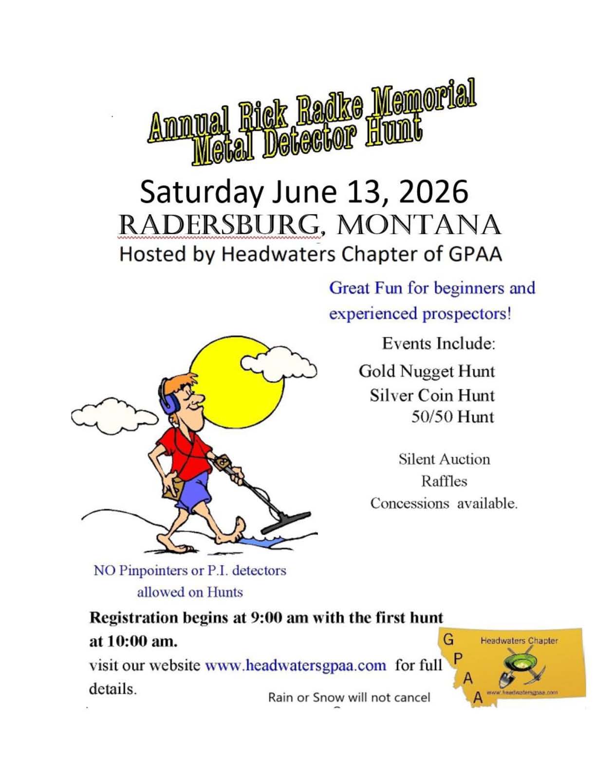The annual Rick Radke Detector Hunt is normally in June, 2026 will be held June 13, in Radersburg, Montana. The public is welcome! There are several types of hunts during the day, including a hunt specifically for kids. In addition to hunts, there are auctions, silent auctions, raffle for mining equipment, and great food!
